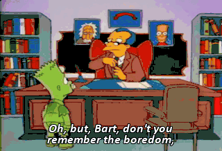 Oh, but, Bart, don't you remember the boredom, the ennui, the intellectual malaise ? Yeah, well, you know, kinda, um, but I was thinking I could go undercover. Undercover ? Bart, I'm intrigued. Go on.