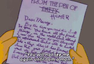 "You will not see me again until I am a man." Oh, Homer... Homer! We're all in shock. I thought he'd tWo-time you for a while first.