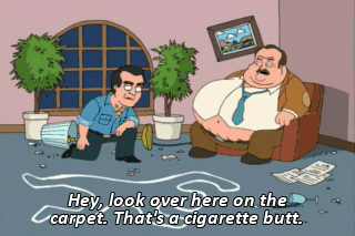 Hey, look over here on the carpet. That's a cigarette butt. This is probably evidence.