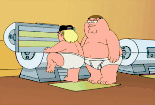 Hey, what kind of tanning booth is this? Can't you read? Those aren't tanning booths. That whole row is time machines! Aw, Crap! Where the hell is he?