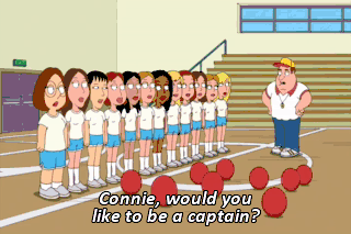 Connie, would you like to be a captain? Sure. I pick everyone except Meg. Fair enough. Go! (WHISTLE BLOWING) Ow! Ow! Ow! Ow! Ow! Ow! (GROANS)