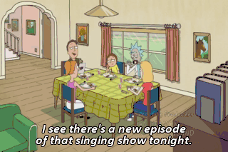 I see there's a new episode of that singing show tonight. Who do you guys think is gonna be the best singer? Oh, my God. His head is in his food. I'm going to puke.
