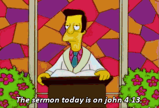 The sermon today is on john 4:13. I think it was jesus who said... "Blessed are those"-- Oh, the heck with it. Church dismissed. All right.
