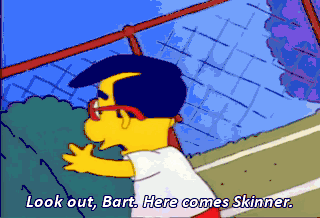 Look out, Bart. Here comes Skinner. Yikes ! Hmm. Whoever did this is in very deep trouble. And a sloppy speller too. The preferred spelling of "Wiener" is w-i-e-n-e-r,