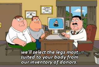 we'll select the legs most suited to your body from our inventory of donors. Hey, what about these? Good choice. These are the only ones we have in stock that aren't hilarious.