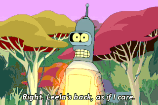 Right. Leela's back, as if I care. (SARCASTICALLY) Whoo! All right, Leela! (ALL CHEERING) (SIGHS) Thanks. It's so nice to wake up and see... (GASPS) Leela! Leela? Leela? Leela.