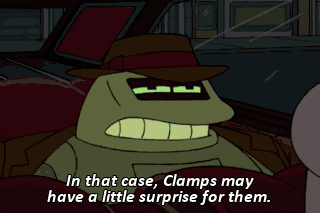 In that case, Clamps may have a little surprise for them. The clamps! Right? Ah, no! A strike? Now I'll never get to bend anything! Oh, woe is Bender! Hang tough, brother.