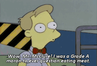 Wow, Mr. McClure! I was a Grade A moron to ever question eating meat. Yes, you were, jimmy. Yes, you were. Ow. You're hurting me.