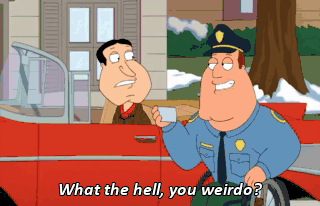 What the hell, you weirdo? (LAUGHS) I'm just having fun. In fact, as I say to all the ladies, Giggity Giggity. You don't say that. I say that. You're a bad person. (TIRES SCREECHING)