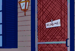"Wel-diddly-elcome, Simpsons." Oh, geez! He actually wrote "diddly." That was thoughtful. "I left a few helpful notes around the house." Ah, Come-- Gee!