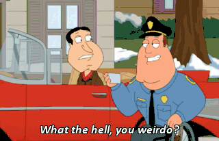 What the hell, you weirdo? (LAUGHS) I'm just having fun. In fact, as I say to all the ladies, Giggity Giggity. You don't say that. I say that. You're a bad person. (TIRES SCREECHING)