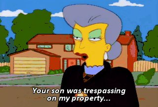 Your son was trespassing on my property... and destroyed a very valuable stone gargoyle and-- Are you wearing a grocery bag? I have misplaced my pants.
