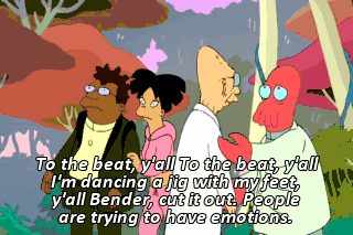 To the beat, y'all To the beat, y'all I'm dancing a jig with my feet, y'all Bender, cut it out. People are trying to have emotions.