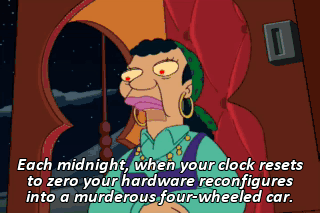 Each midnight, when your clock resets to zero your hardware reconfigures into a murderous four-wheeled car.