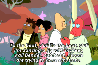 To the beat, y'all To the beat, y'all I'm dancing a jig with my feet, y'all Bender, cut it out. People are trying to have emotions.
