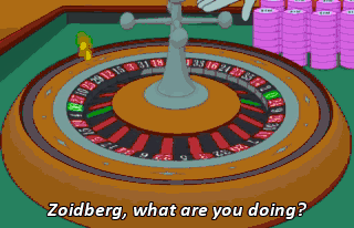 Zoidberg, what are you doing? I don't know. I think it's called roulette. 34 red. You win $288 million. (ALL CLAMOR ENTHUSIASTICALLY)