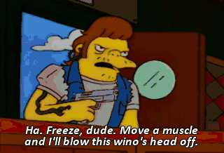 Ha. Freeze, dude. Move a muscle and I'll blow this wino's head off. I'm behind three inches of bulletproof glass. Do your worst.