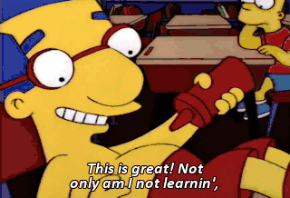 This is great! Not only am I not learnin', I'm forgettin' stuff I used to know. And it's all thanks to you, Bart. - Yeah, great. - What's the matter?