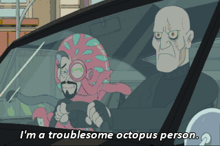 I'm a troublesome octopus person. Uh-Oh. I gotta save some trouble 'cause here comes a trouble mite. SUMMER: Gross! Does all interdimensional TV have to rely on juvenile violence?