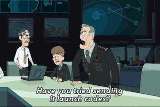Have you tried sending it launch codes? Mr. President, what America's got is 70,000 megatons of kaboom-boom, and I say we show it right up this floating head's ass. No, you need to let me talk!