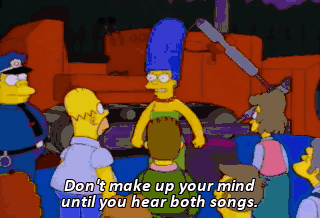 Don't make up your mind until you hear both songs. Morals and ethics and carnal forbearance-- Uh, sorry. Thanks a lot, Marge. That was our only burlesque house.