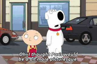 Oh. I thought Paris would be a bit more picturesque. Instead it's just traffic and some big guy using a jackhammer. But monsieur, this is not a jackhammer. It is a Jacqueshammer. (DRILLING IN FRENCH ACCENT)