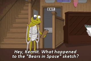 Hey, Kermit. What happened to the "Bears in Space" sketch? Sorry, it's "Pigs in Space" now. There's been a change. What? There's been a change!