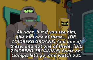 All right, but if you see him, give him one of these... (DR. ZOIDBERG GROANS) And one of these, and not one of these. (DR. ZOIDBERG GROANING) Come on, Clamps, let's go, and watch out,