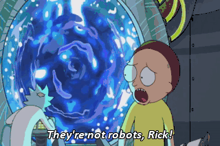 They're not robots, Rick! It's a figure of speech, Marty, They're bureaucrats. I don't respect them. Just keep shooting, Marty, You have no idea what prison is like here!