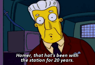 Homer, that hat's been with the station for 20 years. He had one day left till retirement. La la la la la Well, time to replenish the hot-dog roller.