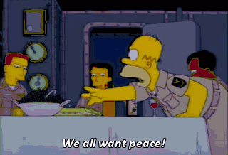 We all want peace! But it's always just out of reach. Oh! Uh-huh. So, what's the best way to get peace? With a knife! Exactly! Not with the olive branch, but the bayonet.