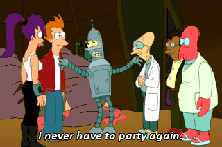 I never have to party again. Well, that's that then. We're back, everyone! Party! (ALL CHEERING) Yeah! Whee!