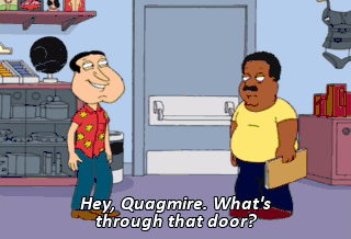 Hey, Quagmire. What's through that door? Oh, that's the exit. Of course, in this place every exit's also an entrance. Giggity Giggity Giggity Goo. Make 'em laugh, make 'em laugh