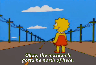 Okay, the museum's gotta be north of here. Now, which way is north? Aha! It's springtime, so the geese must be flying back north! Hey!