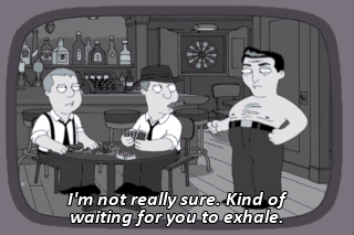 I'm not really sure. Kind of waiting for you to exhale. (EXHALES) Actually, yeah. I do have a problem with that. Oh, come on. Stupid satellite TV. Maybe I have to fix the dish.