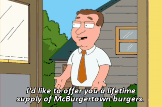I'd like to offer you a lifetime supply of McBurgertown burgers. Free burgers? Oh, man, this is a way better offer than the one I got from Helen Hunt. You wanna have sex? No. No, no, no, no, no.