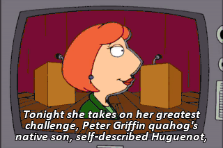 Tonight she takes on her greatest challenge, Peter Griffin quahog's native son, self-described Huguenot, don't know what that means, and community activist. Go, Dad. He can't hear you. Go, Dad!