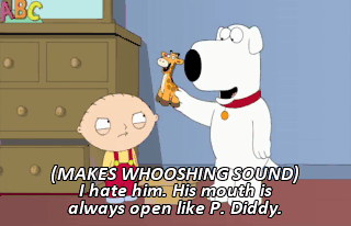 (MAKES WHOOSHING SOUND) I hate him. His mouth is always open like P. Diddy.