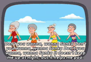 Don't you wanna, wanna Sanka Don't you wanna, wanna Sanka Don't you wanna, wanna Sanka It doesn't keep me up at night, but it helps me poo.