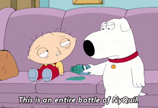 This is an entire bottle of NyQuil. I know, and it's doing wonders. Come here, puss. Come here. Come here, puss. Here, puss. What are you doing? Calling the cat. We don't have a cat. That's a throw pillow.