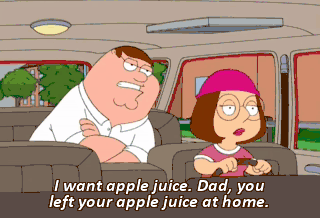 I want apple juice. Dad, you left your apple juice at home. I want apple juice!