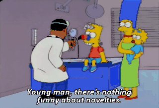 Young man, there's nothing funny about novelties. I mean, they're humorous and all, but, uh, this is certainly no laughing matter. Can you help him, Doctor? Oh, my, yes.