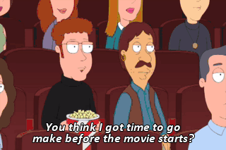 You think I got time to go make before the movie starts? Just make sure you get back in. You got your stub in your pocket? That's hurtful. All right, come on, hurry up, Brian.