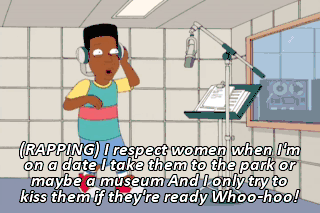 (RAPPING) I respect women when I'm on a date I take them to the park or maybe a museum And I only try to kiss them if they're ready Whoo-hoo!