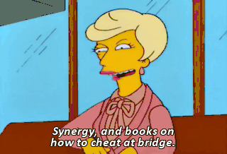 Synergy, and books on how to cheat at bridge. Lisa, I think you'll really enjoy it here.