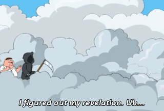 I figured out my revelation. Uh... God loves a working man. No! The Shadow is in reality Lamont Cranston, wealthy young man about town. No! Oh, crap! I'm latE.