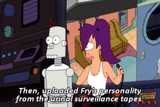 Then, uploaded Fry's personality from the urinal surveillance tapes. I sure love Leela. FARNSWORTH: Alas, in recreating Fry's adorable jelly-belly, she had overstuffed him with copper wadding.