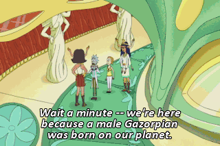 Wait a minute -- we're here because a male Gazorpian was born on our planet.