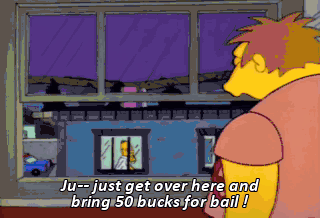 Ju-- just get over here and bring 50 bucks for bail ! Fifty bucks ? What'd you do ? Kill a judge ? Where am I gonna get 50 bucks ? Pizza !