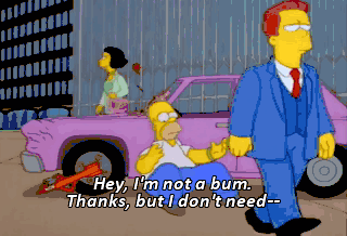 Hey, I'm not a bum. Thanks, but I don't need-- Okay, if you insist, but-- Spare change, lady? Lousy cheapskate. So hungry. Can't leave car.